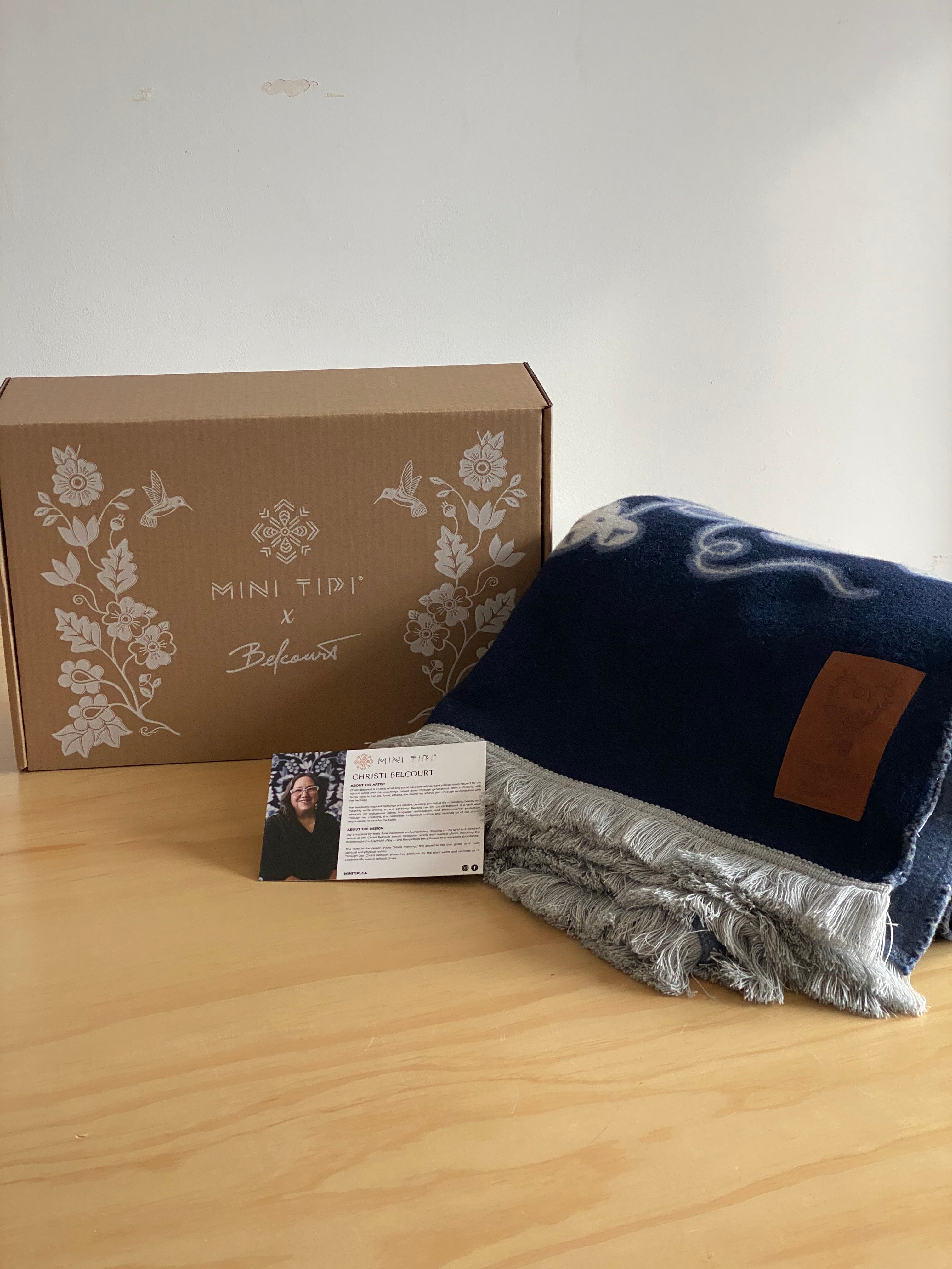 This wool Indigenous blanket is the result of a meaningful collaboration between MINI TIPI and Métis artist Christi Belcourt, whose iconic painting JOY comes to life in woven form.